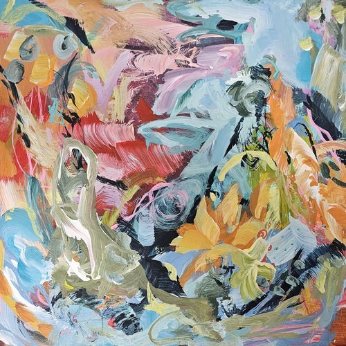 ‘Blooms and Butterflies’ is an original unframed acrylic painting on a 12”x12”x1.5” gallery canvas.